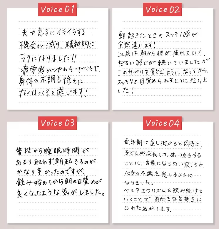 「私にもついに来たか…」と不安になっていたところ、このサプリに出会えてよかった!手軽に対策できるものがあると安心しますね。